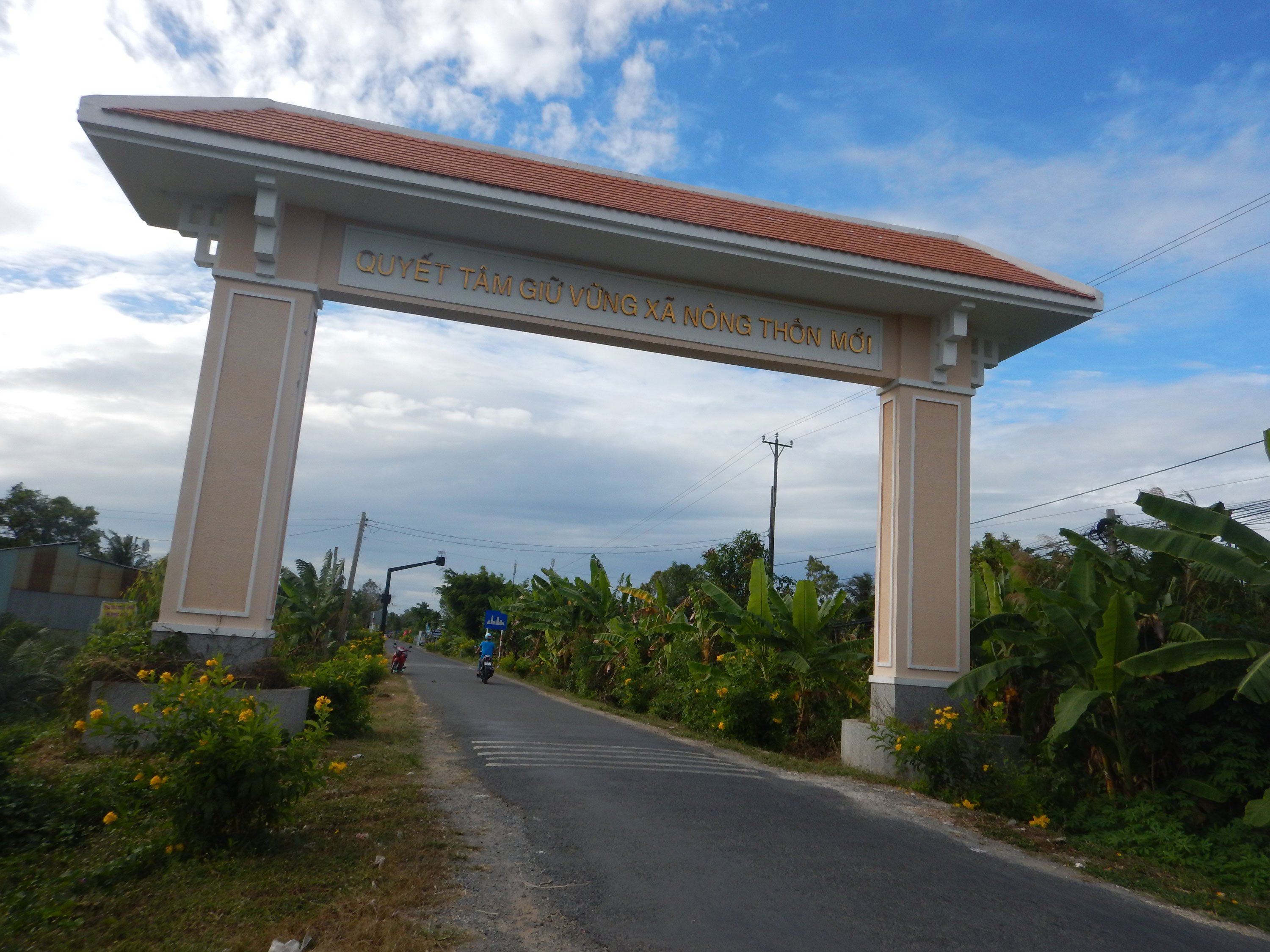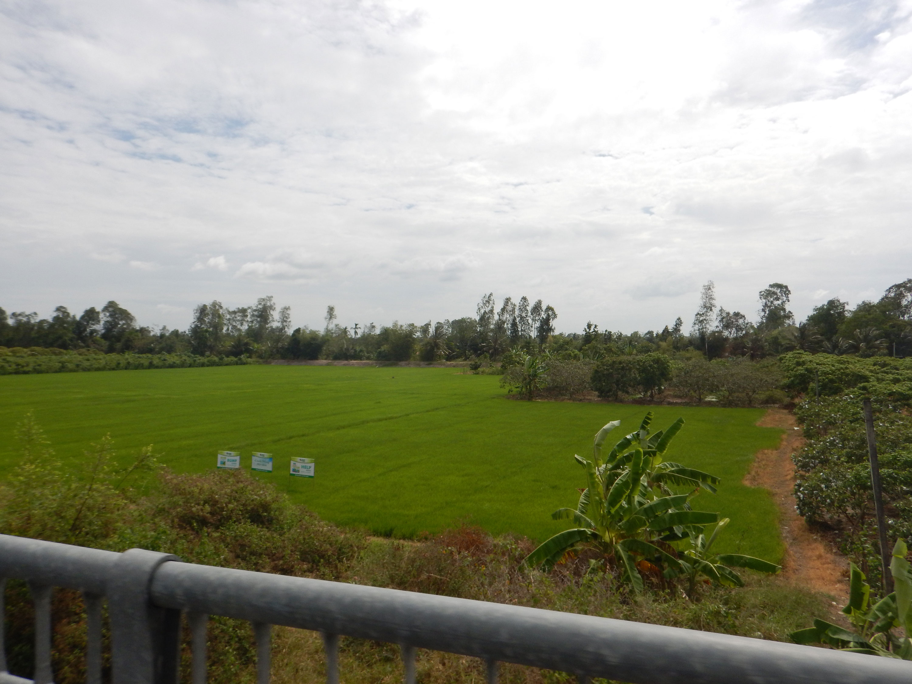 Direkt in den morgendlichen Berufsverkehr. Aber wir erfahren Vietnam-Traveller haben das natürlich gemeistert. Spannend wurde es erst als wir festgestellt haben, dass das Benzin fast alle ist. Also haben wir eine Tankstelle gesucht. Dank dem undeutbaren Wedeln in alle Richtungen hat es etwas gedauert, bis wir eine gefunden haben. Aber auf dem Weg wollte uns sogar ein Motorrad-Fahrer sein Benzin aus seinem Motorrad geben! Mit vollem Tank ging’s raus aus der Stadt durch wunderschöne Reisfelder und Palmen Plantagen.
